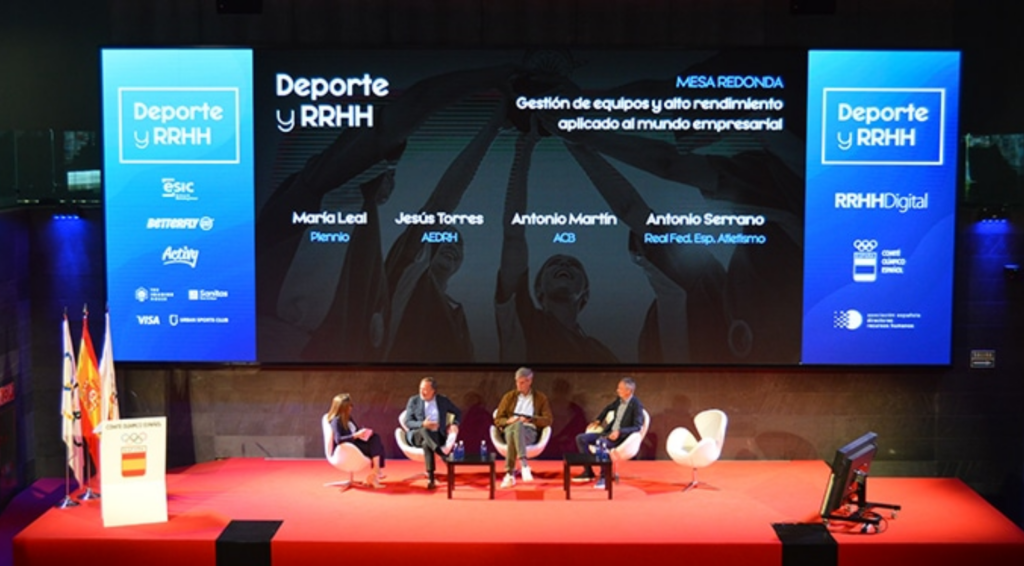 Posteriormente, se dio inicio al primer bloque con una mesa redonda moderada por María Leal, CEO y Fundadora de Plennio, en la que participaron Jesús Torres, Presidente de AEDRH, Antonio Martín, Presidente de ACB, y Antonio Serrano, entrenador de la Real Federación Española de Atletismo. La mesa, titulada “Gestión de equipos y alto rendimiento aplicado al mundo empresarial”,