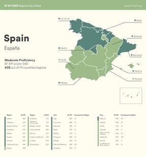 - España se mantiene en el puesto 33, justo entre Italia (32) y Francia (34). Con 545 puntos, la media de los españoles tiene un “nivel medio” de inglés.