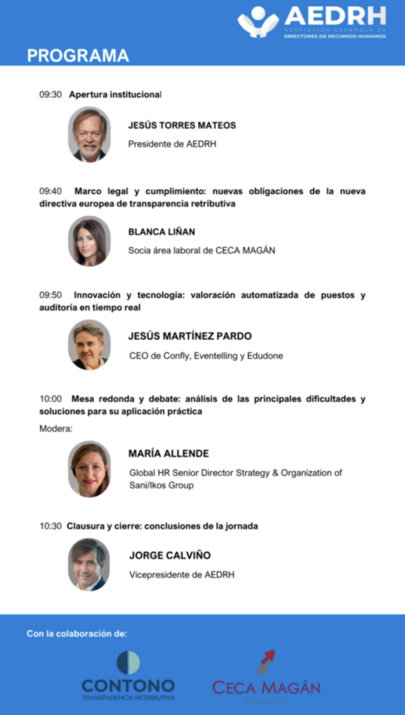La Directiva Europea 2023/970 convierte la transparencia salarial en una prioridad urgente para los departamentos de RR. HH. La AEDRH celebrará el 29 de abril una jornada técnica que abordará las nuevas obligaciones legales y la valoración automatizada de puestos. Una mesa redonda moderada por María Allende analizará los retos reales y soluciones prácticas para aplicar la Directiva. El encuentro mostrará cómo la transparencia retributiva puede convertirse en una oportunidad para transformar la cultura salarial empresarial.