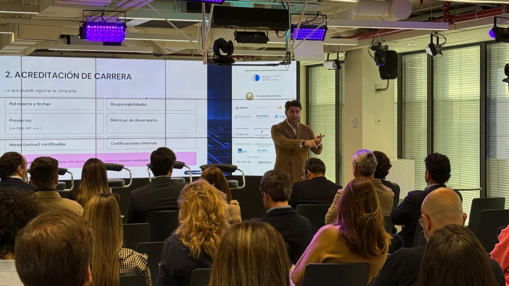 Posteriormente, tuvo lugar la mesa redonda “Aplicaciones y desafíos del blockchain en la gestión del talento”, con la participación de Mario Cameo, Director de Cultura y Personas en GESVALT y miembro de la comunidad de Innovación AEDRH; Jaime Estévez, CEO y Fundador de The Truth; Ingrid González, Directora área de Protección de Datos y Derecho Digital de CECA MAGÁN Abogados; José González, Cofounder & CTO del World Token Congress y de Tokenkey; Fernando Castillo Orejón, Director General en The Valley Talent (Grupo UAX), quienes compartieron sus experiencias y las de sus organizaciones, abordando casos prácticos, retos y oportunidades del uso del blockchain en RR. HH., y ofreciendo una visión clara y aplicable sobre el potencial transformador de esta tecnología en la gestión del talento.